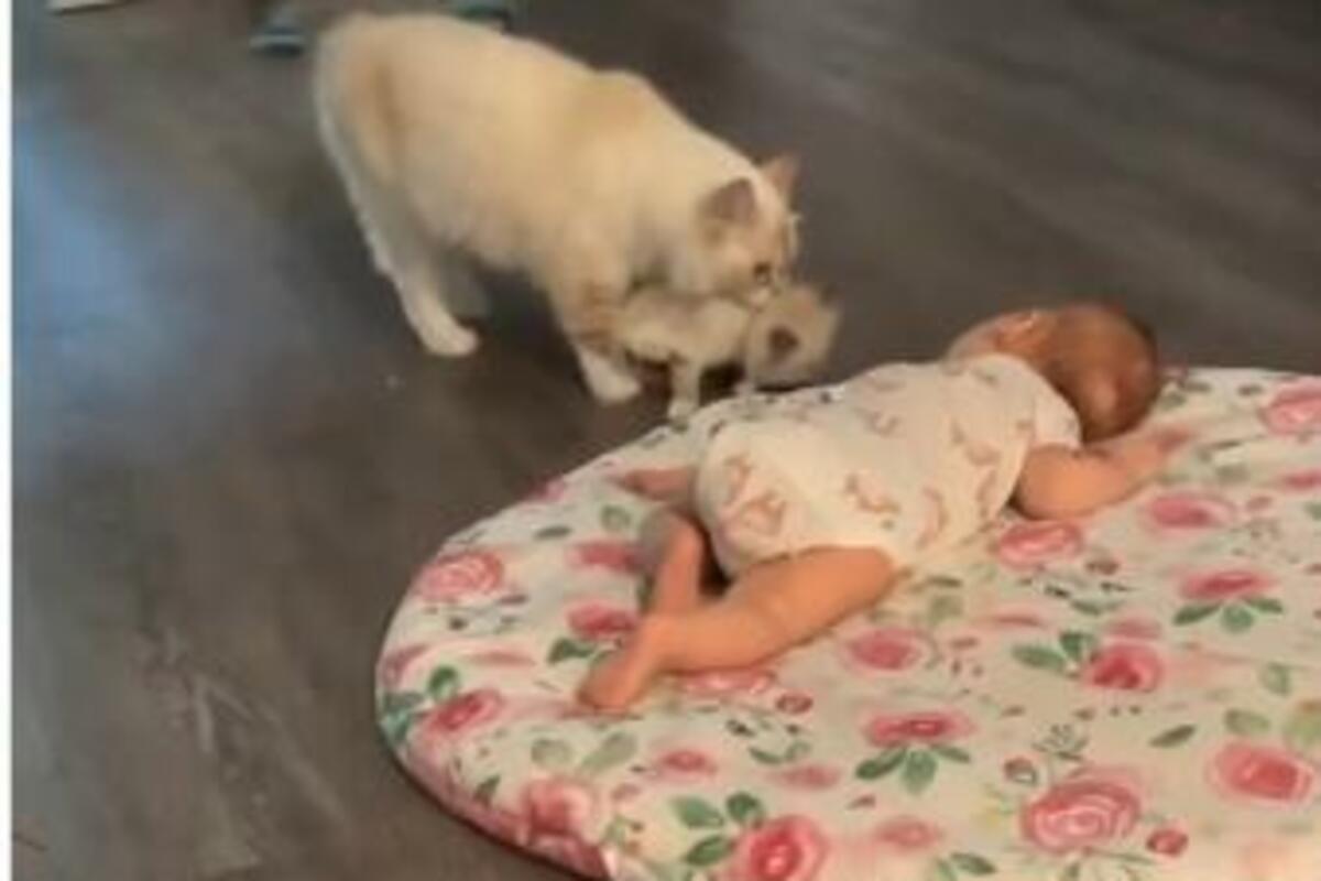 Mačka, očigledno kućni ljubimac te porodice došla je do bebe. Prelepa belo siva mačka u ustima je nosila svoje maldunče i spustila ga pored bebe koja je bezbrižno spavala. Mače je pokušalo da pobegne ali ga je mama uporno vraćala pored bebe.