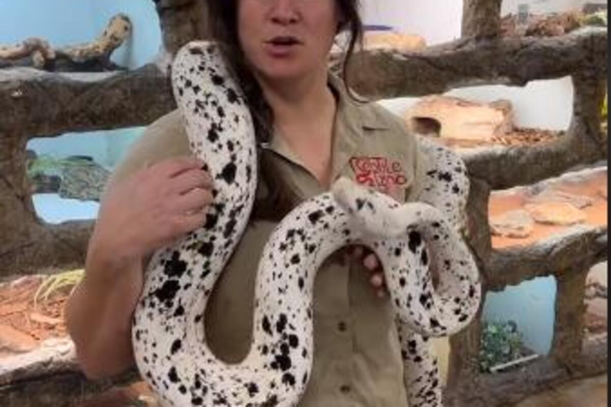 Žena koja brine o ovom lepotanu ispričala je mnogo zanimljivih detalja o zmiji posebnog "dezena" koja je na svet stigla potpuno bela. Mrežasti piton ovog varijeteta vremenom dobija pege kako stari.