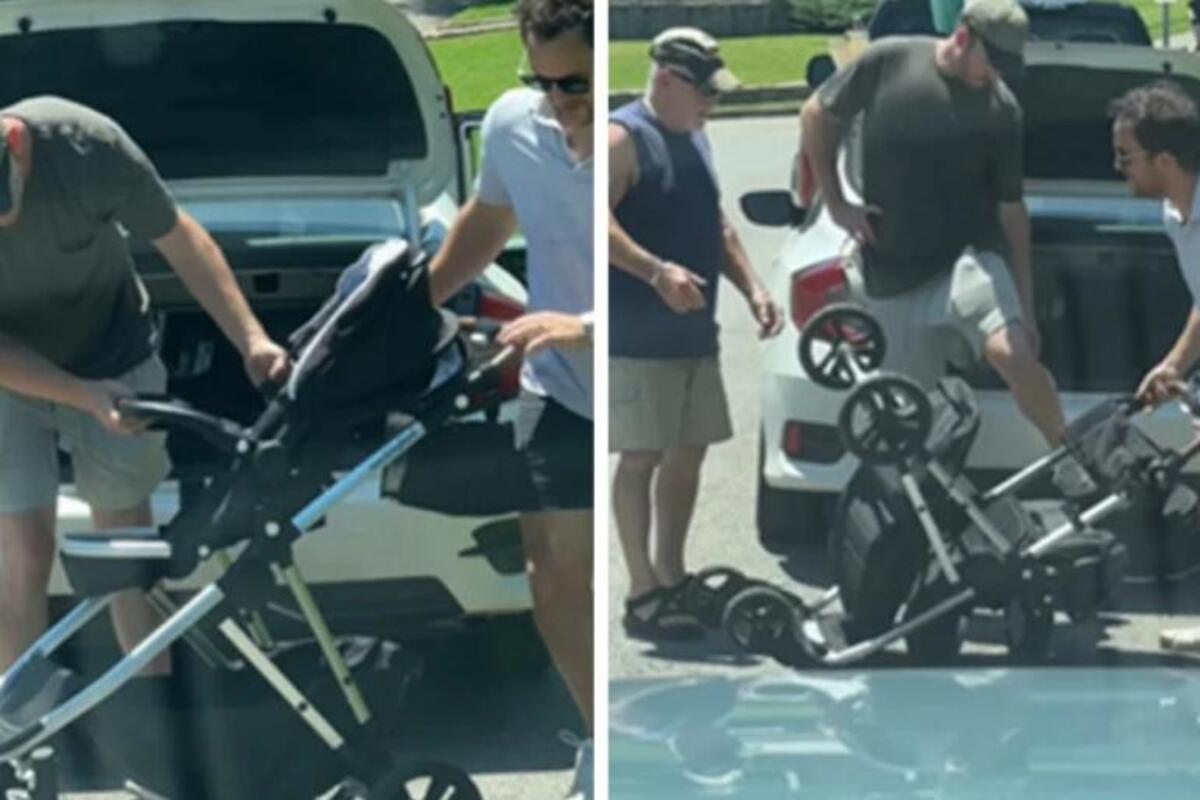 Dok se on mučio pokušavajući da odgonetne mehanizam, prišao mu je drugi tata da bi mu pomogao. Ali, avaj, od pomoći nije bilo ništa. Njih dvojica su prevrtala kolica, pa im se pridružio i treći muškarac, ali ni on nije bio od velike pomoći.