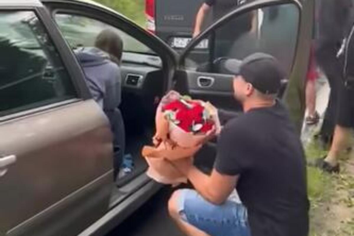 Nekoliko trenutaka kasnije, Gruča se pojavio sa prstenom i buketom, a ona je prestravljena sedela u kolima i plakala, ali mu je, srećom, na kraju rekla "da".