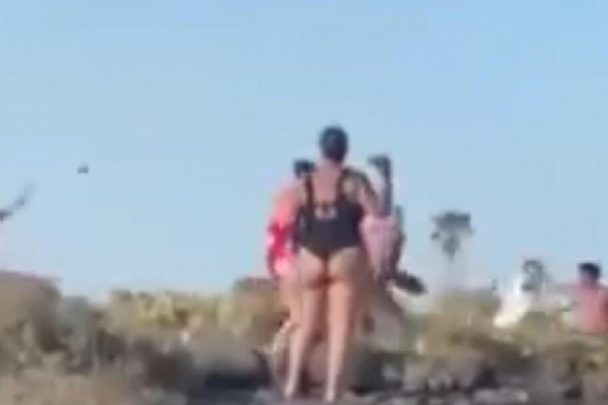 Videozapis žestokog obračuna na plaži Las Burras prikazuje muškarce i žene u kupaćim kostimima kako vrište i bacaju kamenje jedni na druge.