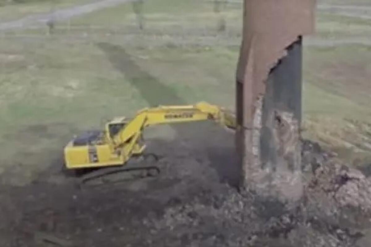 Ovaj nešto stariji snimak je neverovatan – prvo zbog veličine dimnjaka koji treba da bude srušen, a drugo, zbog bagera koji izgleda kao mala igračka pored njega.