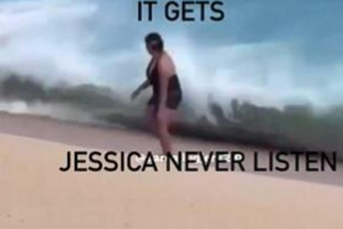 Korisnik sve vreme naglašava kako Džesika ne zna da pliva, ali i dalje pokušava da uđe u more uprkos talasima koji je nose.