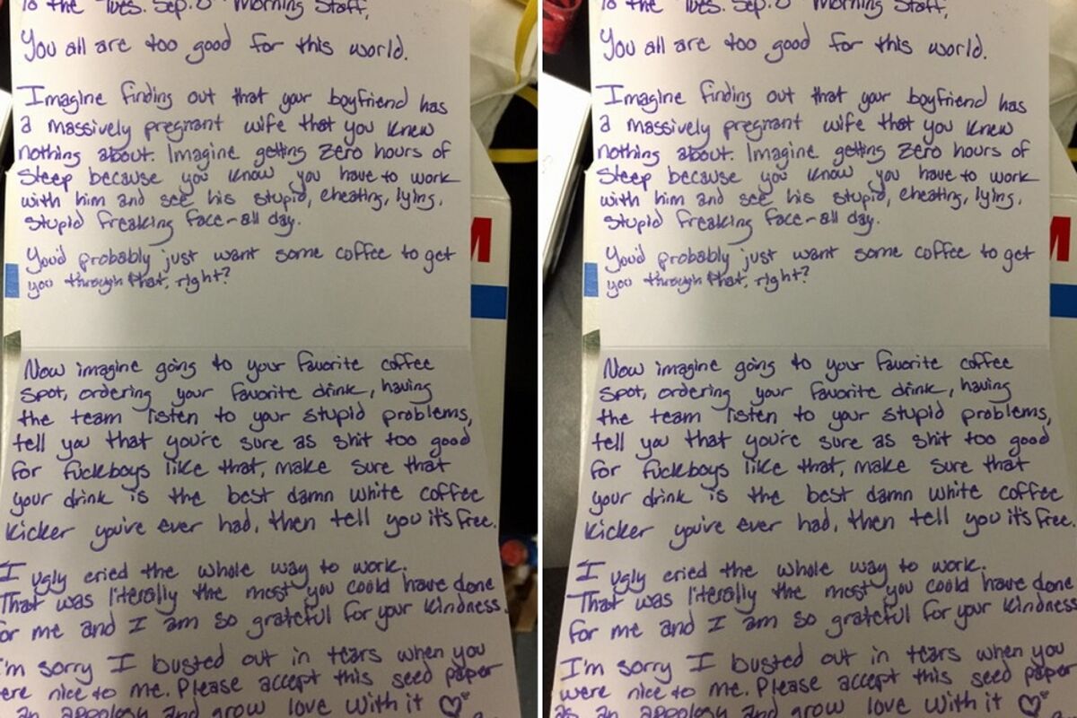 Ona je napisala pismo konobarima koji su joj dali besplatnu kafu jer su videli koliko ju je pogodilo to što je saznala o muškarcu kog je volela