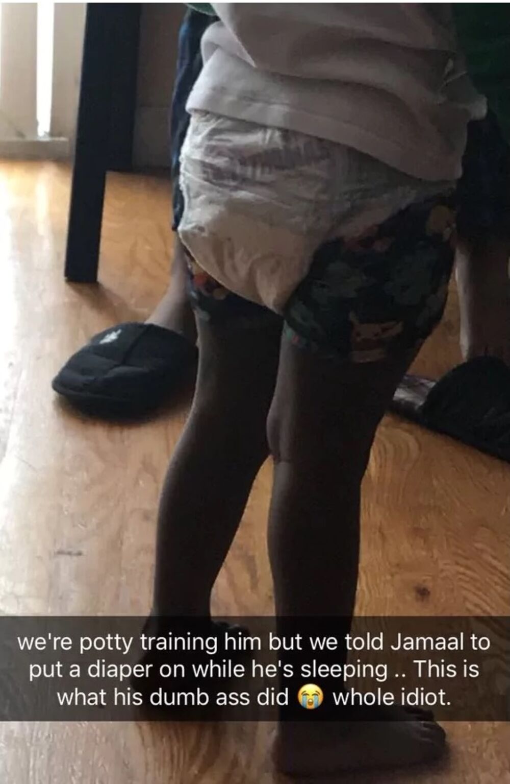 Osim njega, na internetu je postao popularan i otac koji s ene razme baš u oblačenje dece. Njegovo dete upravo uči kako da koristi nošu, zato su mu tokom noći potrebne pelene. Supruga mu je rekla da tokom noći detetu stavi pelenu, što je on i uradio, ali preko pidžame.