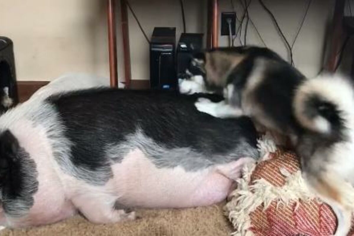 Porodica koja živi u tom gradu ima dva jako zanimljiva kućna ljubimca - svinju i haskija. Oni su objavili snimak na kojem se vidi kako svinja nezainteresovano leži dok je pas gurka i poziva na igru.
