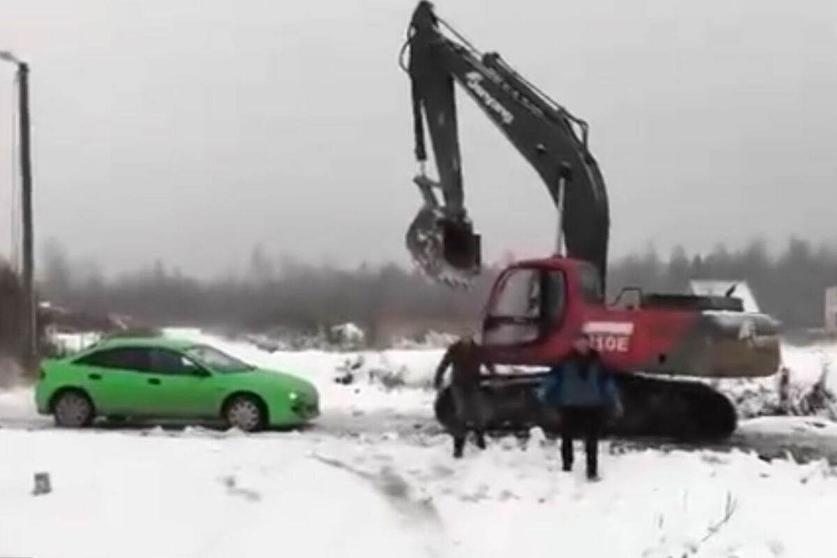 Dvojica nestrpljivih Rusa, verovatno nezadovoljnih što ne mogu da prođu od bagera, izašla su iz automobila i isprebijali nesrećnog bageristu koji im je preprečio put.