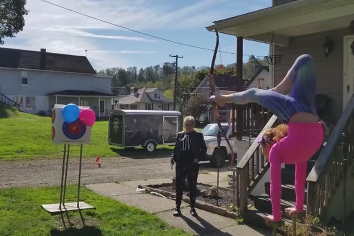 To izgleda tako što se devojčica prvo popne na ruke, zatim noge postavi iznad glave, jednim stopalom drži luk, a drugim strelu.