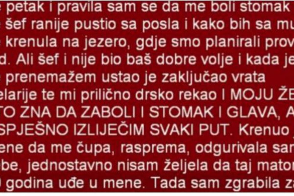 Ali šef i nije bio baš dobre volje i kada je video da se prenemažem ustao je zaključao vrata kancelarije pa mi prilično drsko rekao I MOJU ŽENU ČESTO ZNA DA ZABOLI I STOMAK I GLAVA, ALI JE JA USPEŠNO IZLEČIM SVAKI PUT. Krenuo je na mene da me čupa, rasprema, odgurivala sam ga od sebe, jednostavno nisam želela da taj matorac od 50 godina uđe u mene. Tada sam zgrabila za vaznu sa cvećem koja mu je bila na stolu i nekontrolisano, iz sve snage ga udarila po glavi. Nije izgubio svest, ali mu nije bilo dobro, ali nikako.