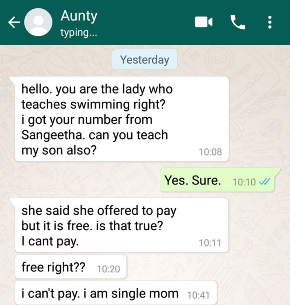 "Zdravo, vi ste žena koja podučava plivanje? Dobila sam broj od Sangheethe. Možete li podučavati mog sina?" pitala je žena, na što je devojka pristala.