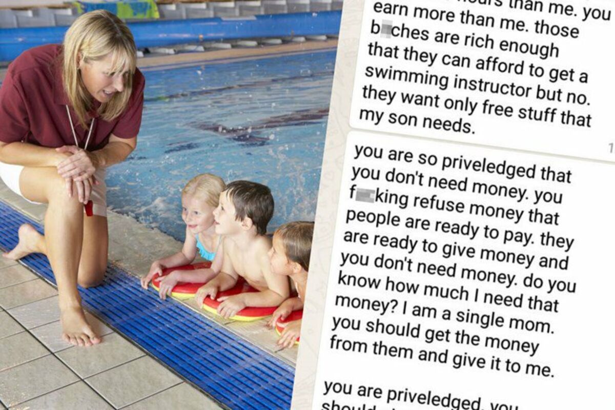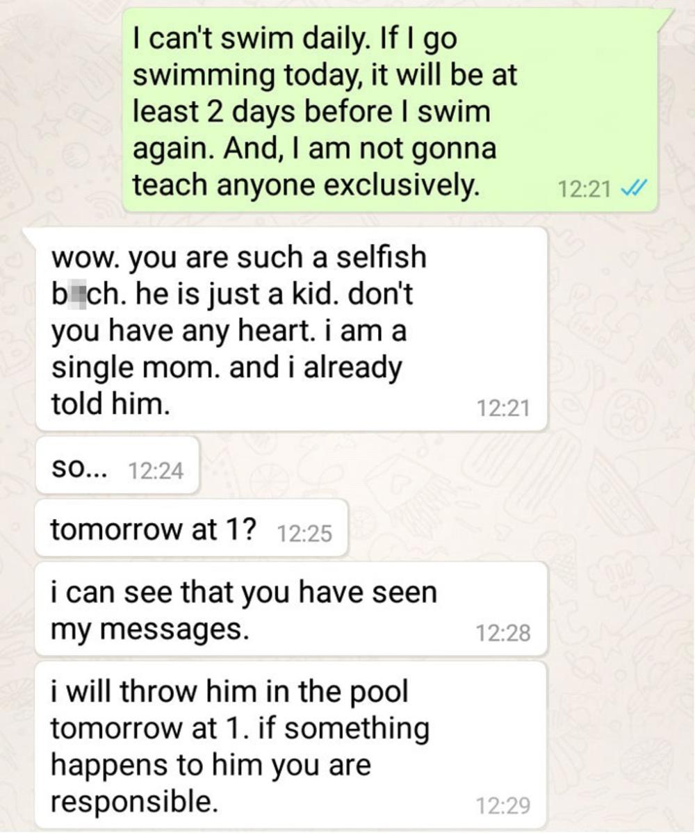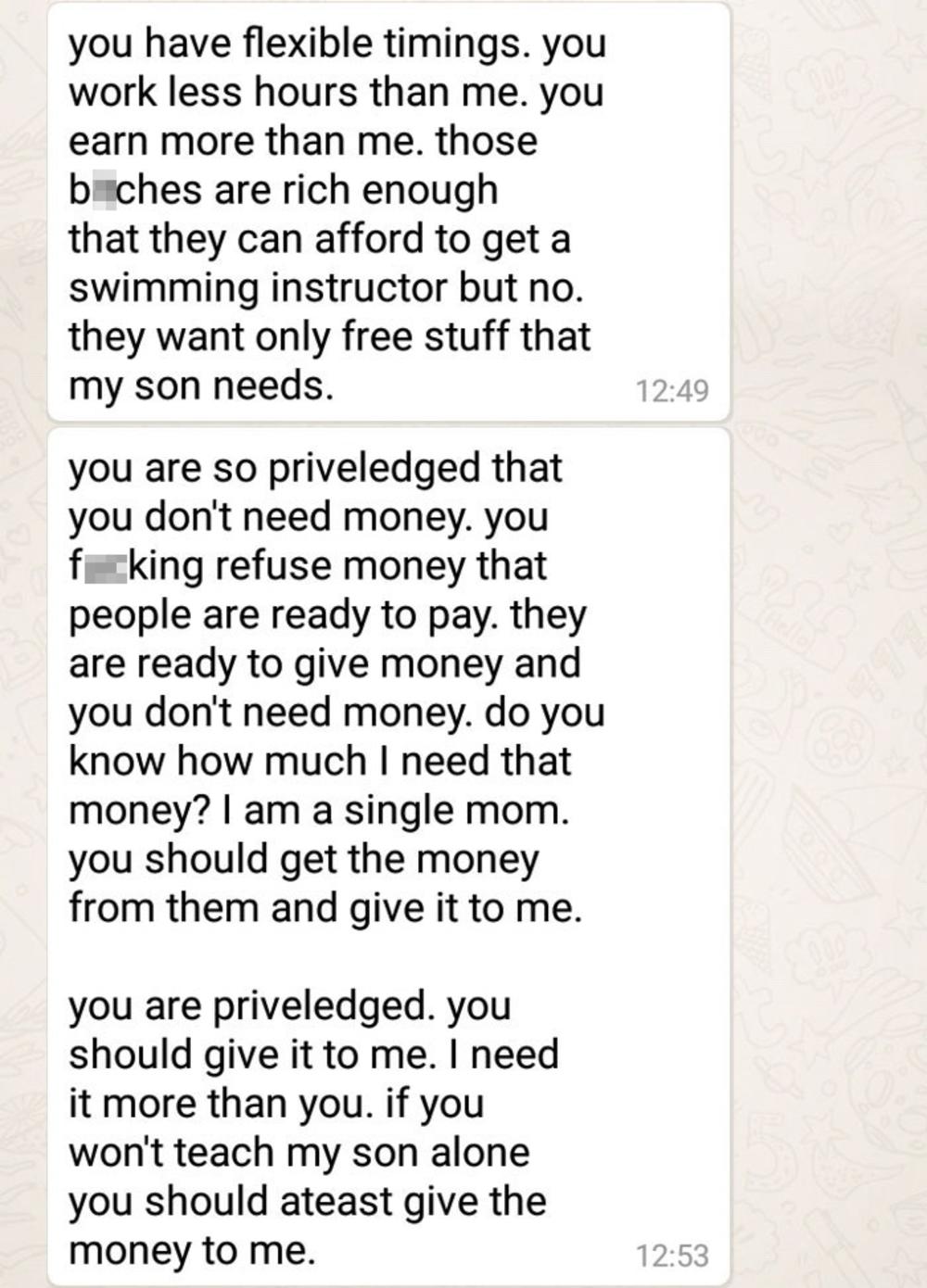 "Vi ste takva sebična kuja. On je samo dete. Nemate li srca? Ja sam samohrana majka i već sam mu rekla da sutra ide na plivanje. Sutra u 13? Vidim da ste pročitali moje poruke. Baciu ga u bazen u 13, ako mu se nešto dogodi, vi ste krivi. Nema veze, verojatno ste očajna učiteljica. Zaista ste grozna i užasna osoba. Moj sin ovo nije zaslužio, ne znam čime sam ja to zaslužila. Zašto su svi tako sebični i nespremni pomoći? Imate fleksibilne termine. Radite manje od mene. Zarađujete više od mene. Te kuje su dovoljno bogate da mogu da priušte svojoj deci instruktora plivanja, ali ne, one žele samo besplatne stvari koje su potrebne mom sinu. Toliko ste privilegovani da vam ne treba novac. Jebeno odbijate novac koji ljudi žele da vam daju. Žele vam dati novac, a vama ne treba. Znate li koliko meni treba novac? Samohrana sam majka. Treba da uzmete njihov novac i date ga meni. Privilegovani ste, treba meni da ga date, treba mi više od vas. Ako nećete da podučavate mog sina, dajte mi novac. Odgovorite mi, vidim da čitate, kujo", pisala je besna žena, na što joj devojka nije odgovorila.