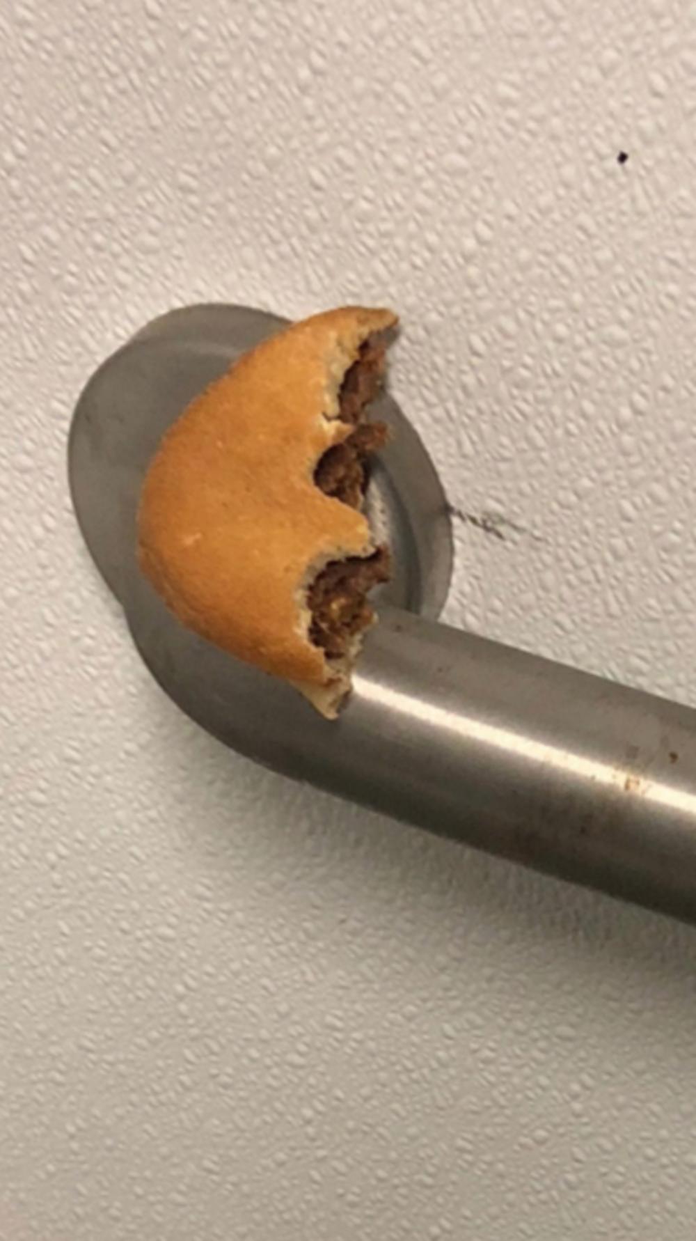Da, dobro ste videli. Čovek drži hamburger da prezalogaji u toaletu.