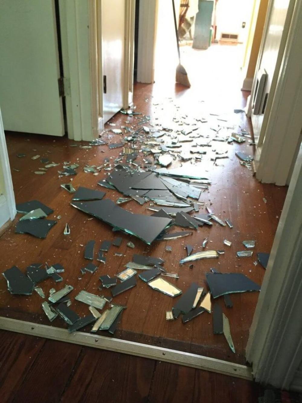 Bila sam tiha. Pregledala sam štetu i duboko udahnula. Odvela sam psa van da se ne poreže, mačku sam stavila u podrum iz istog razloga.