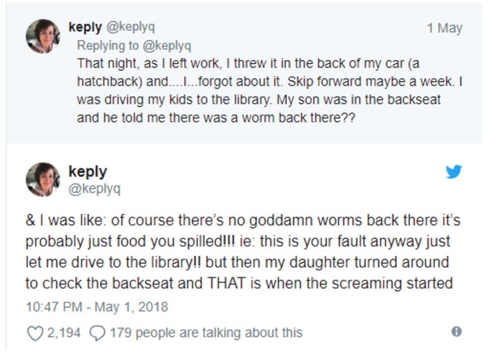 Nekoliko dana posle, još uvek pronalazi crve u automobilu, a njena priča sad je postala viralna.