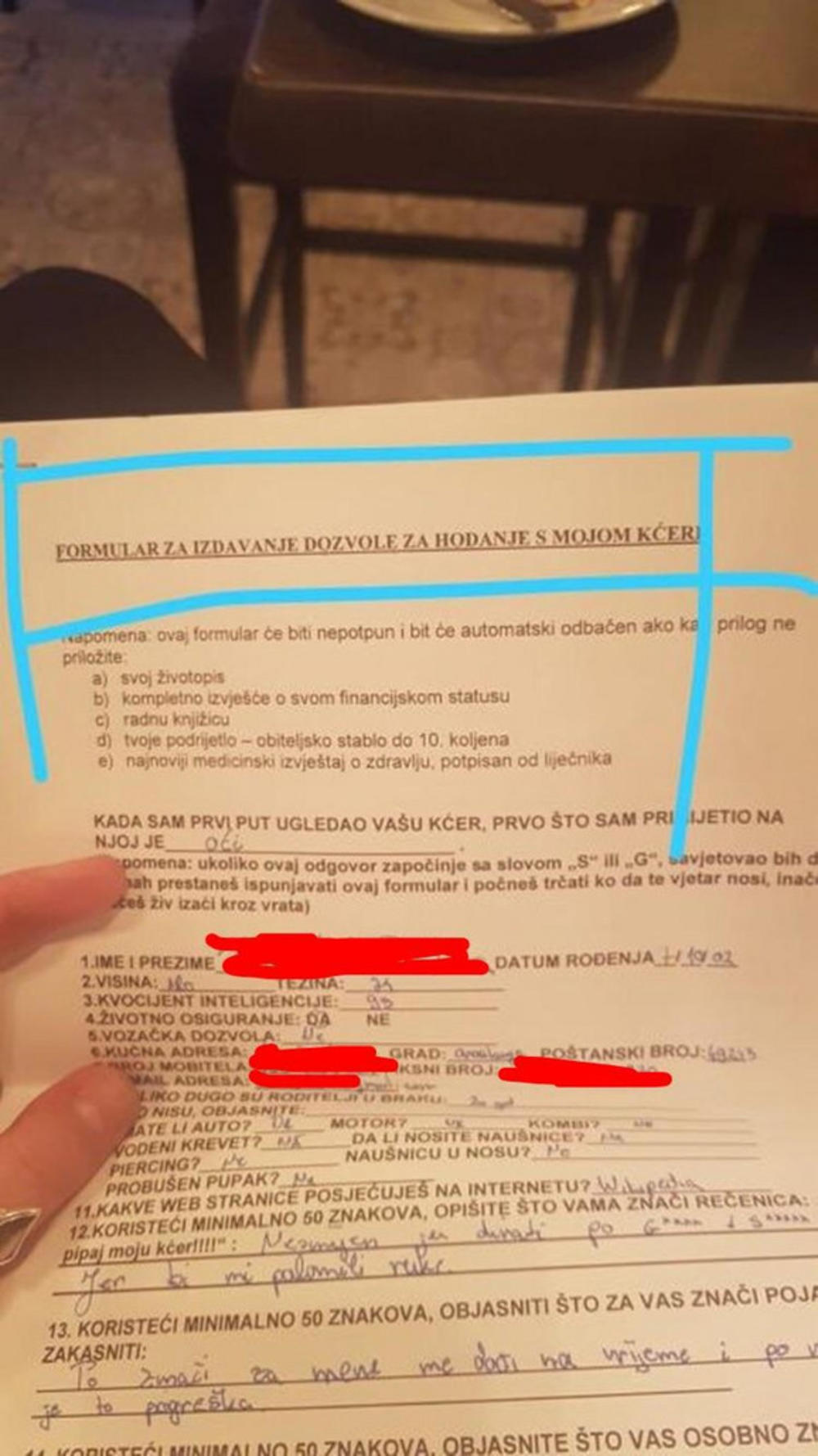Na Facebook stranici “Sviraj kraj, nema dalje” neko je pokazao kako to izgleda kad mu se svidi ćerka “opasnog” tate. Naime, jedan otac je osmislio čitav formular koji udvarač mora da popuni ako želi da izađe sa njegovom ćerkom.