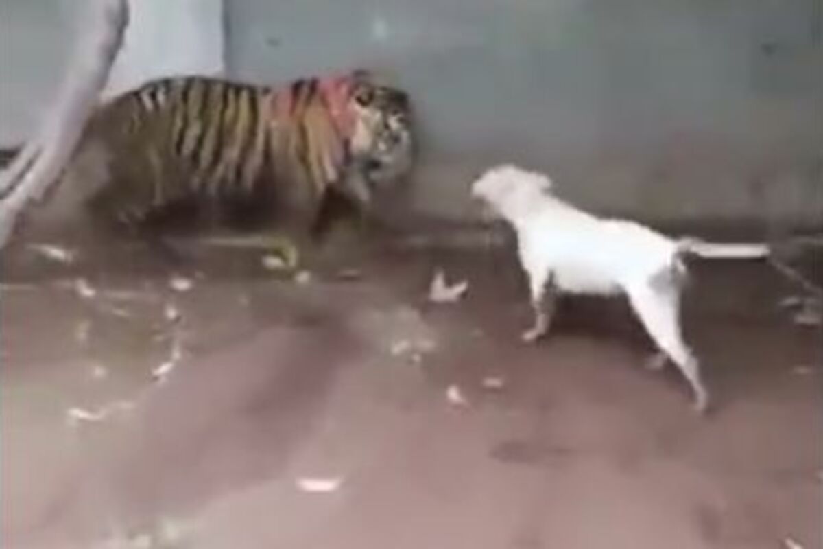 Na snimku koji kruži društvenim mrežama vidi se borba mladog tigra, koji je vezan u dvorištu, verovatno u nekoj azijskoj zemlji, i pitbula, kojeg su vlasnici nahuškali na mladu životinju.