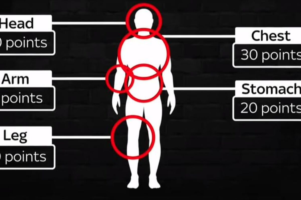 Za pogodak metkom ili ubadanjem u glavu po ovoj skali dobija se maksimalnih 50 peona, ukoliko su meta grudi dobija se 30 poena, dok pucanj ili ubod u stomak vrede 20 poena. Najmanje poena se dobija ukoliko osobu pogodite u nogu (10 poena), odnoso u ruku (5).