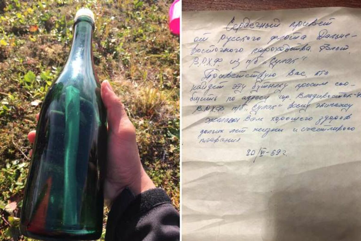 - Srdačan pozdrav ruske flote Vladivostoka. Pozdrav tebi. Ko god je pronašao ovu bocu, traži se da se javi na ovu adresu: grad Vladivostok - 43 VDHF p / b Sulak. Pažnja svima, želim svima dobro zdravlje, dugovečnost i srećnu plovidbu! 20. juna 1959.