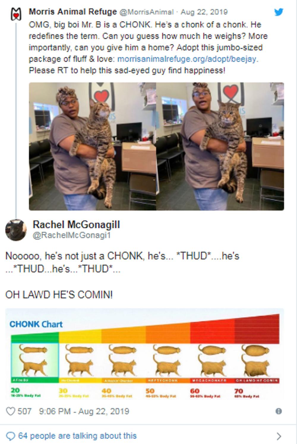 Moris Animal Refuge, sklonište za životinje u Filadelfiji, je na svom Tviteru objavilo fotografije mačke, nadimka Big Boi Mr. B, i u opisu su napisali da traži novi dom. Objava je ubrzo dobila preko 37 000 lajkova i 11 000 tvitova, a ljudi su bili toliko očarani mačkom da se web stranica skloništa srušila.