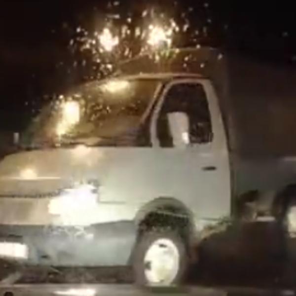 Prvo vidimo da na putu stoje jedan kamion i jedan auto, dok im se automobil čija kamera je sve snimila približava.