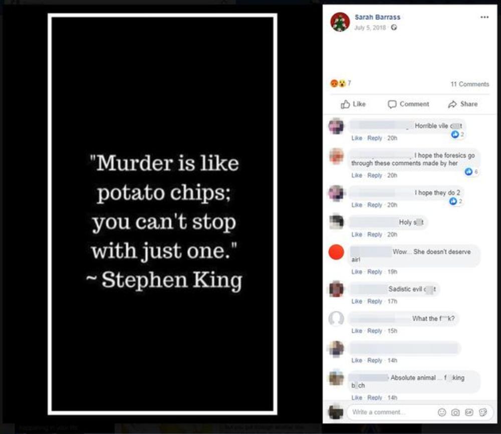 Ubica, koja je u septembru priznala krivicu za ubistvo i zaveru za ubistvo, objavila je citat iz romana Stvena Kinga na svojoj Fejsbuk stranici. Pisalo je: