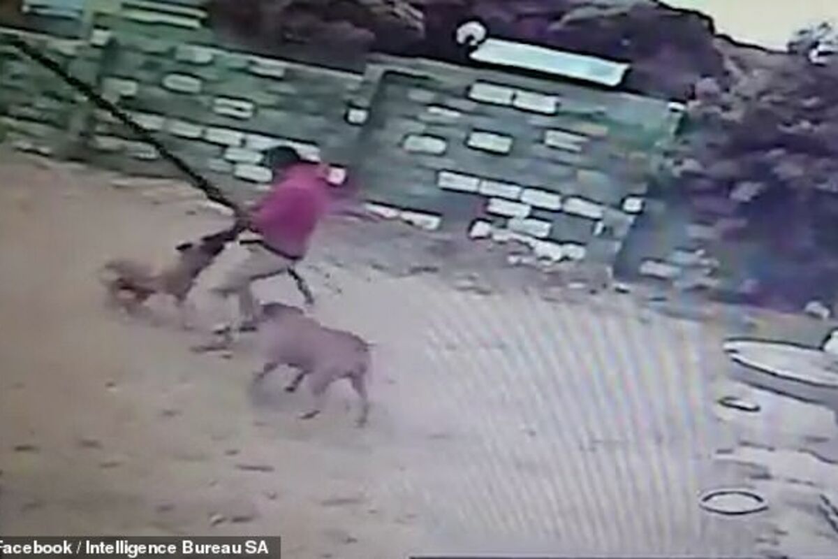 Sninimci nadzornih kamera pokazuju kako dva moćna psa napadaju čoveka, kojeg je progonio građanin koji tvrdi da ga je video kako u ponedeljak napušta dom u Gansbaiju u Južnoj Africi, s vrećom punom dragocenosti.