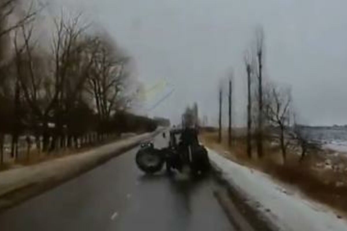 Na snimku se može videti kako putem mirno vozi traktor dok iz suprotnog smera nailazi automobil Chevrolet Lanos.