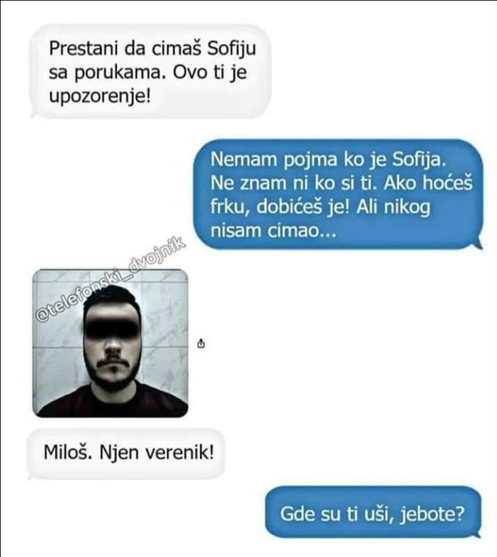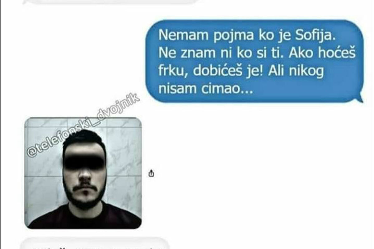 - Nemam pojma ko je Sofija. Ne znam ni ko si ti. Ako hoćeš frku, dobićeš je! Ali nikog nisam cimao...