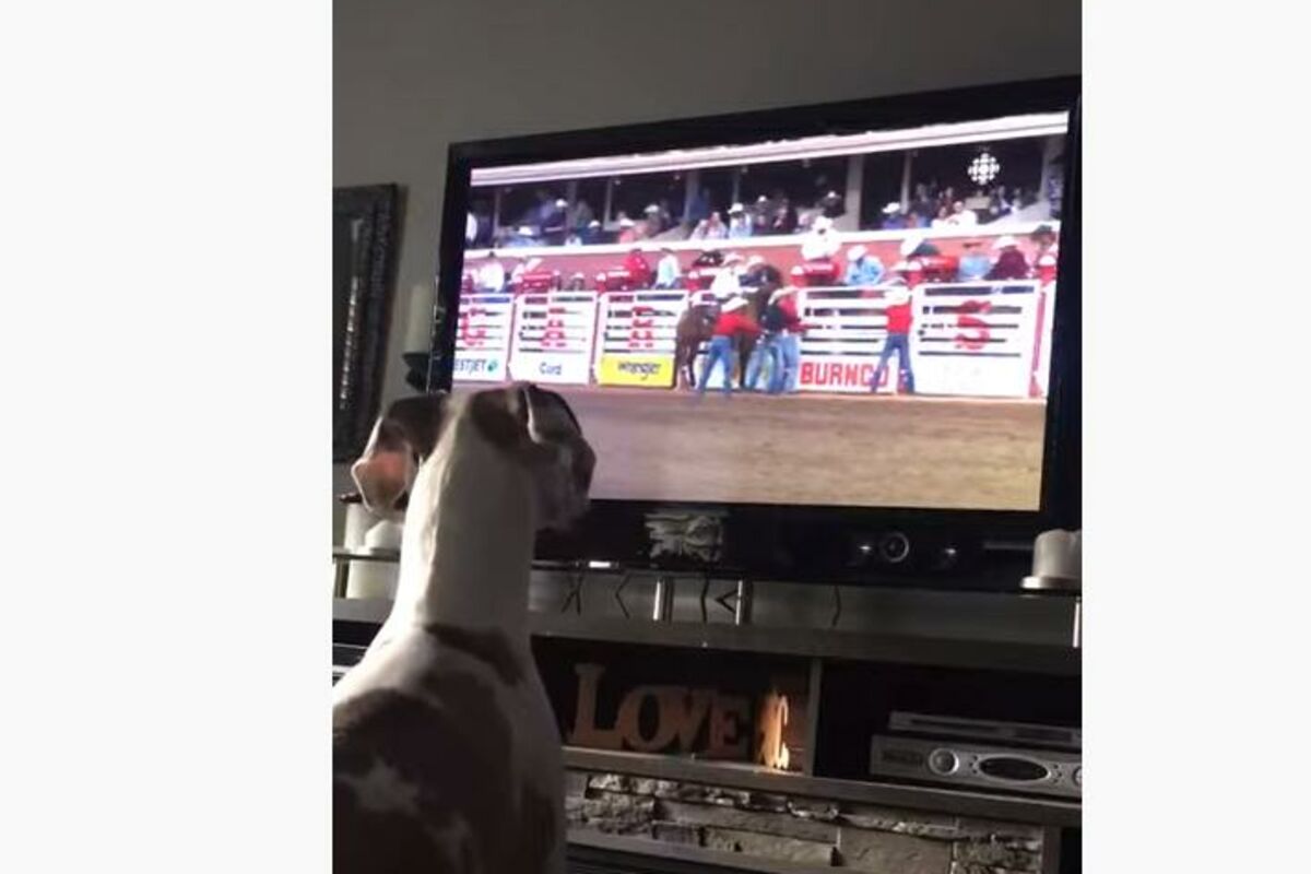 Žena je snimala svog psa, rase nemačka doga, koji se baš "uživeo" u ono što je gledao na televiziji.