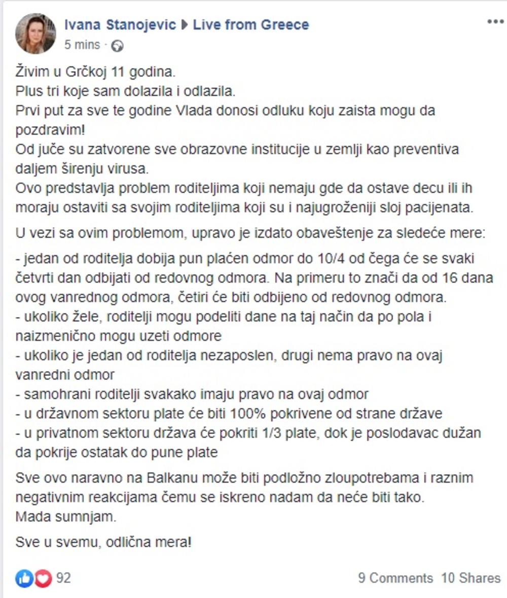 U Fejsbuk grupi "Live from Greece" Srpkinja Ivana Stanojević, koja živi i radi u Grčkoj, nahvalila je mere koje je grčka vlada uvela kao pomoć roditeljima nakon zatvaranja škola.