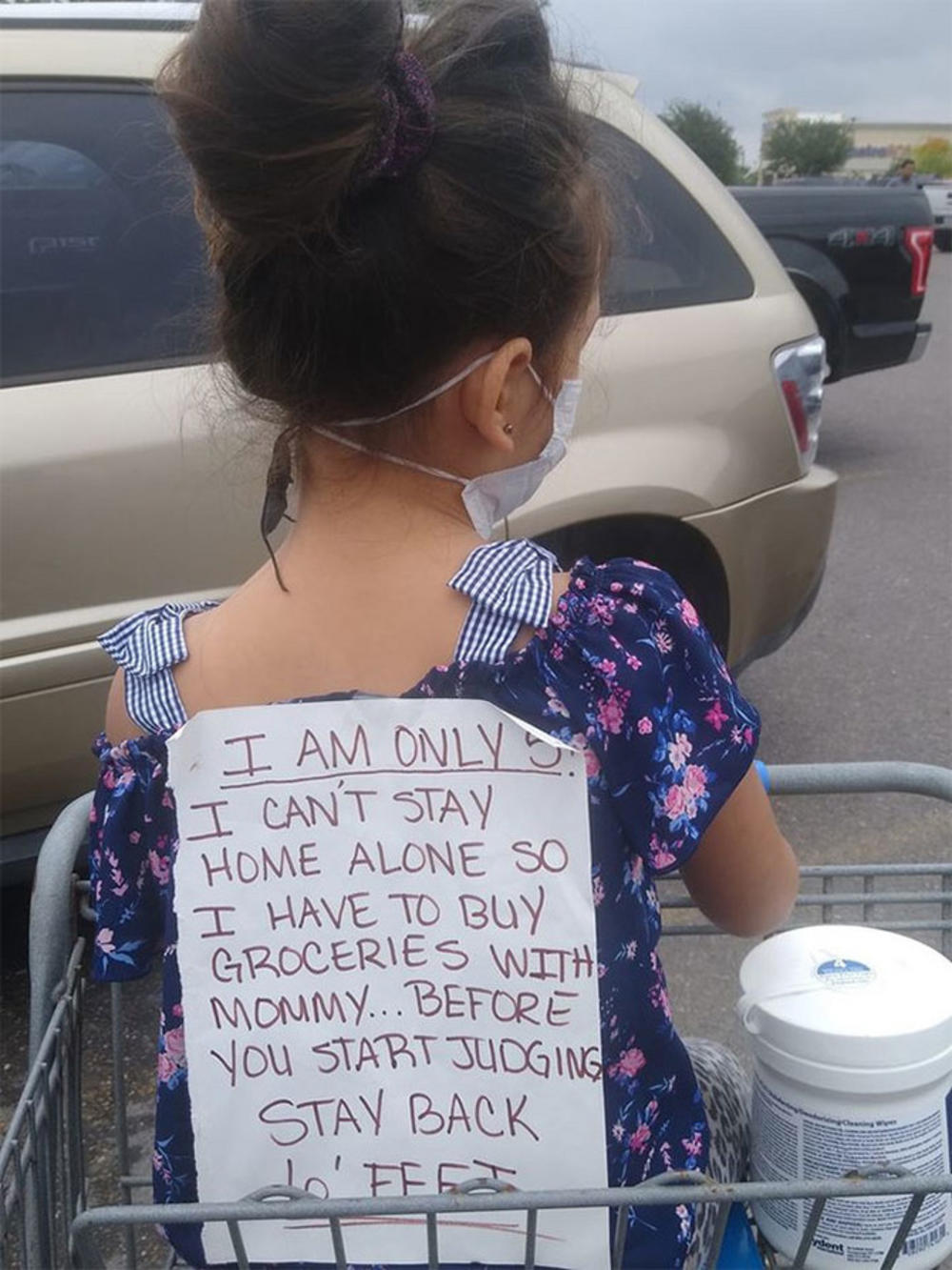 "Imam samo pet godina. Ne mogu da ostanem kod kuće sama. Moram da kupim namirnice sa mojom mamom, pre nego što počnete da osuđujete", piše na papiru koji je na leđima devojčice koja je zaštićena maskom i rukavicama.