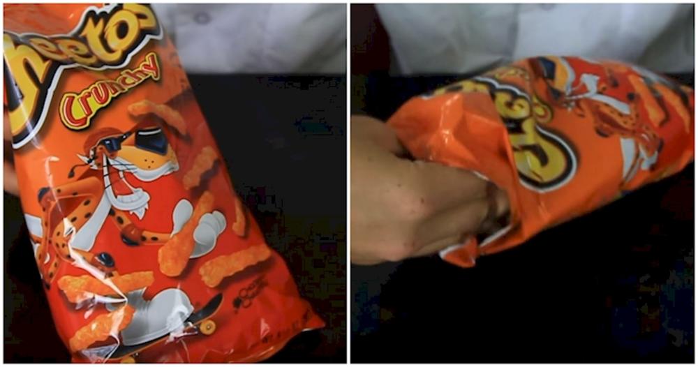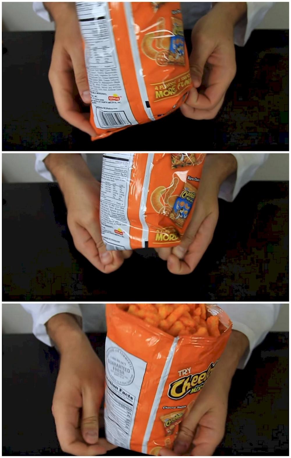 Otvorite kesicu kao i obično i počnite da je rolate na unutra dok se grickalice ne "popnu" do vrha.