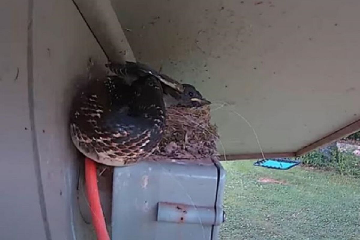 Porodica iz Fajetvila u Arkanzasu postavila je nadzornu kameru kako bi pratila izlegle ptiće dok ne odrastu i ne napuste gnezdo, ali nisu očekivali da će snimiti zmiju kako jede jednog od njih.