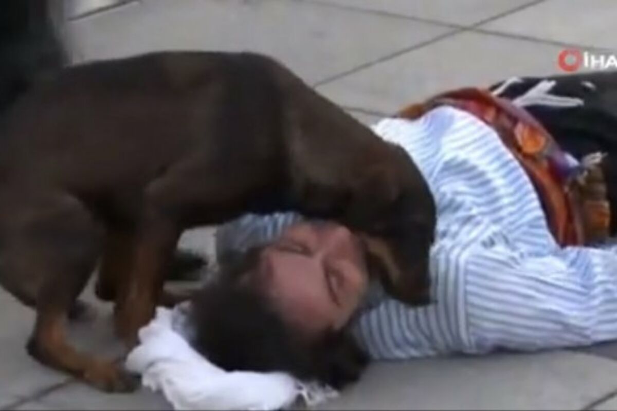 Dok je glumac ležao na zemlji, njegova gluma nije prošla nezapaženo. Sa strane mu je prišao zabrinuti ulični pas, prekidajući predstavu kako bi pružio utehu “povređenom” neznancu.