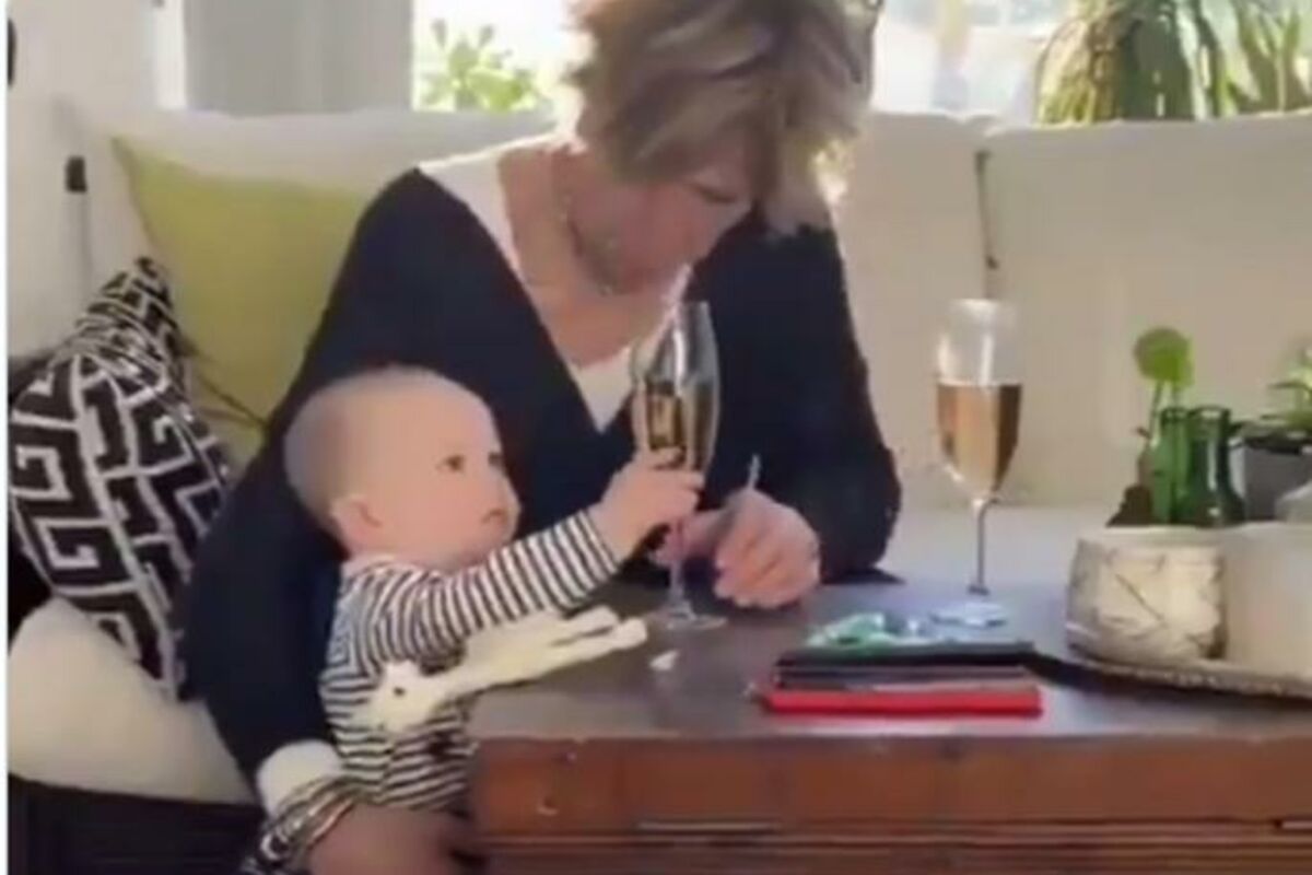 Na snimku baka je ispustila unučića iz ruku da bi dohvatila visoku čašu penušavog vina pre nego što je pala, kako se ne bi razbila.