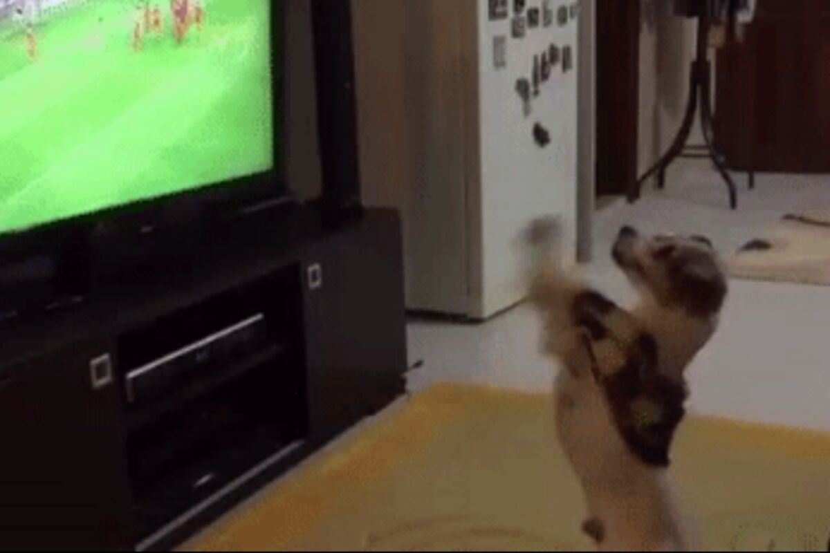 Jedan mali pas toliko obožava fudbal i tim za koji navija, da prosto ne može da se odlepi od televizora dok traje tekma. Molimo vas, pogledajte kako uživljeno proslavlja kada njegov tim da gol!