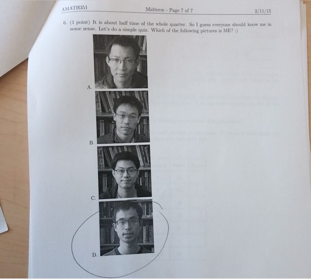 Među pitanja na testu, asistent je ubacio još jedno koje je glasilo: "Prošlo je više od pola semestra, pa pretpostvaljam da me već poznajete. Zato uradite ovaj jednostavan kviz! Na kojoj od sledećih fotografija sam ja? :)"