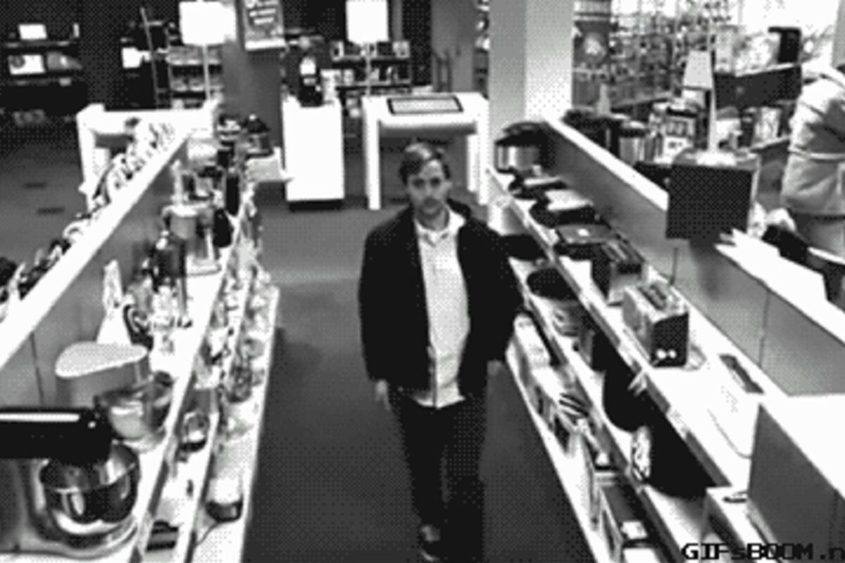 Ovaj lik je očigledno odlično proučio raspored kamera u prodavnici tehnike i uglove pod kojim one snimaju.