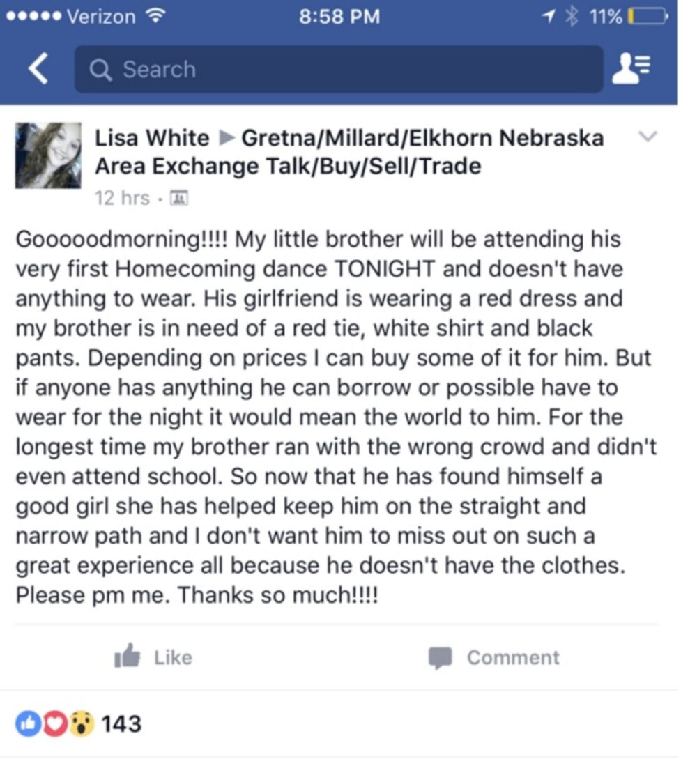- Drugari, dobro jutro! Moj brat večeras ide na maturu, ali nema šta da obuče. Njegova devojka nosi crvenu haljinu, tako da mu treba crvena kravata, bela košulja i crne pantalone. U zavisnosti od cena, ja mogu da mu kupim nešto, ali ako neko ima da mu pozajmi nešto od ovoga to bi bilo sjajno! - napisala je Lisa.