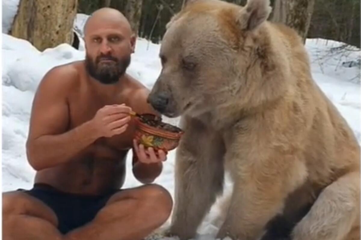 Društvenim mrežama kruži video gde se vidi kako jedan ćelavi i go Rus svira a medved ga grli i umiljava se oko njega.