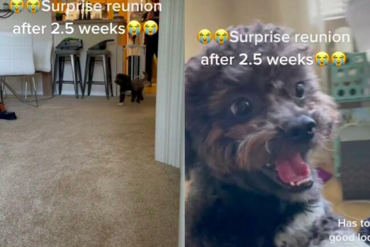Na snimku se vidi, kako, nakon dve i po nedelje razdvojenosti, pas ulazi u prostoriju, ne znajući da je njegova vlasnica tamo.