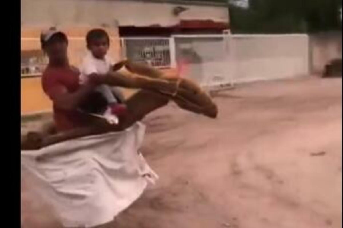 Naime, nepoznati otac je napravio improvizovanog konja od kako se čini drveta i zakačio ga za sebe.