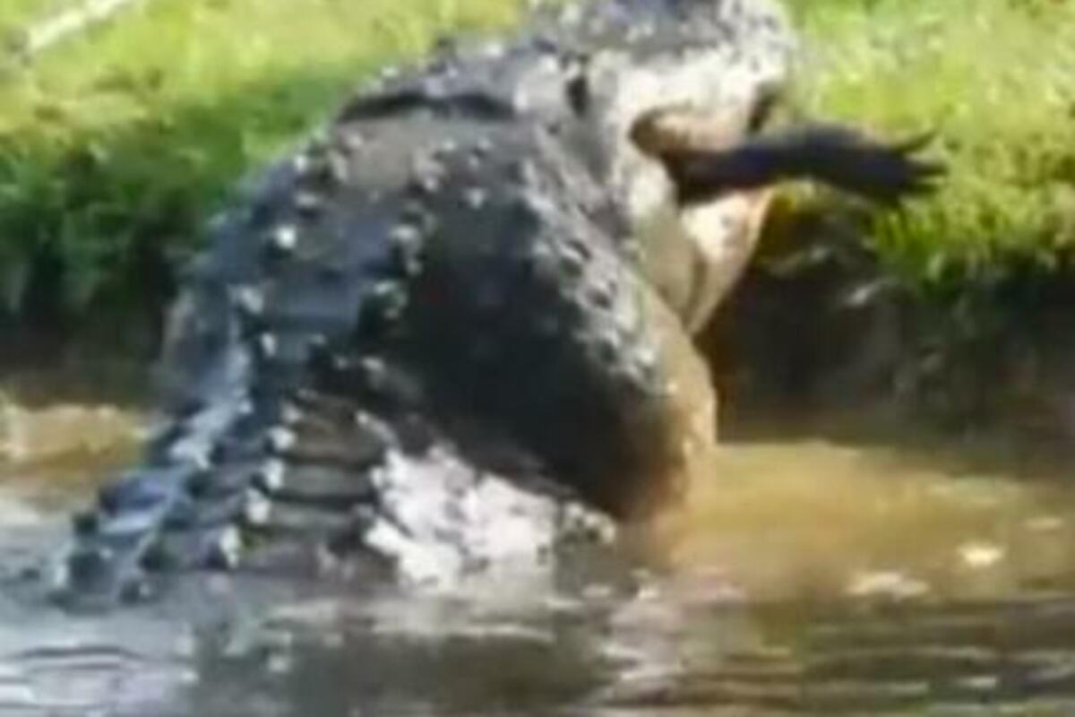 Na snimku se vidi kako iz čeljusti ogromnog aligatora, do pola zaronjenog u jezercetu, vire zadnje noge i rep manjeg aligatora.
