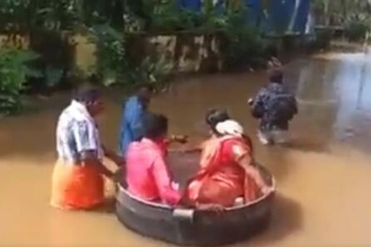 Jedan indijski par došao je na sopstveno venčanje ploveći u ogromnom loncu, jer su ulice njihovog gradića Talavadija bile poplavljene.