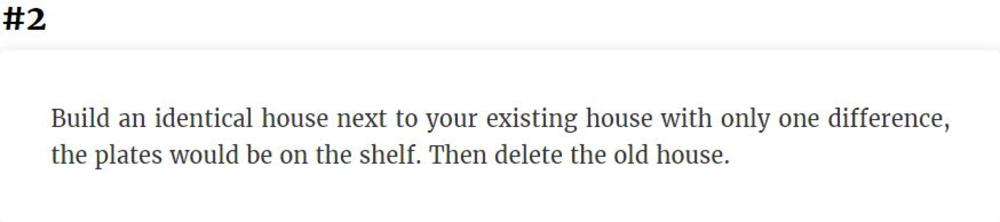 Sazidaj identičnu kuću odmah do postojeće ali sa jednom razlikom, da tanjiri budu na polici. Onda obriši staru kuću.