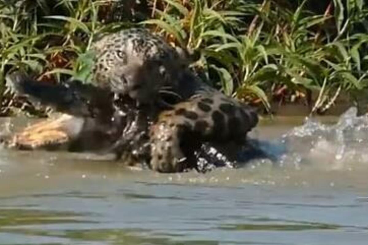 Na snimku koji kruži, predator se hvata za reptila koji se praćaka i zariva mu zube u grlo. Jaguar zatim vuče kajmana na obalu i uvlači ga u žbunje.
