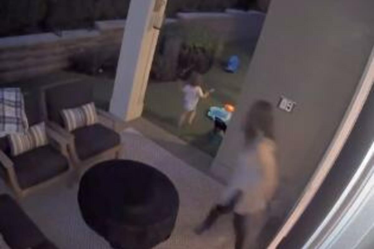 Na snimku se vidi mali crni medved kako trči duž betonskog zida na obodu dvorišta. Dete je pre jurnjave stajalo na ulaznim vratima, ali je onda oduševljeno prepoznalo uljeza.