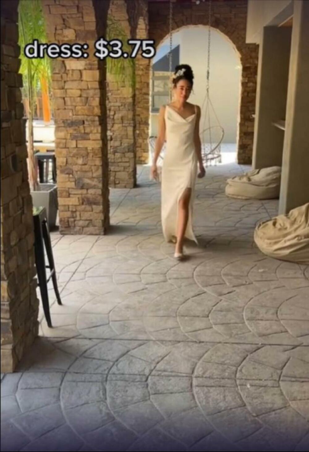 Nakon što je pretražila nekoliko prodavnica, buduća mlada je našla potpuno novu haljinu – sa etiketama, mesec dana pre venčanja. Prvobitno po ceni od 4,99 dolara u prodavnici polovne odeće, cena je snižena na samo 3,75 dolara.
