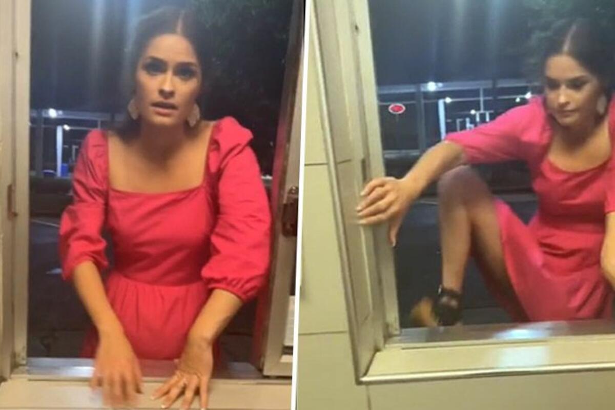 Žena u ružičastoj haljini i štiklama ulazi kroz prozor, zapanjujući celokupno osoblje koje se može čuti kako se smeje tokom celog videa.