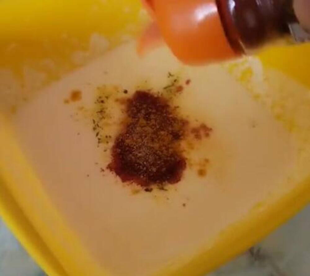 Posle toga u smesu dodaje malo soli, suvi začin, alevu papriku, beli luk u granulama, kari, začin za piletinu i opet sve dobro promeša.